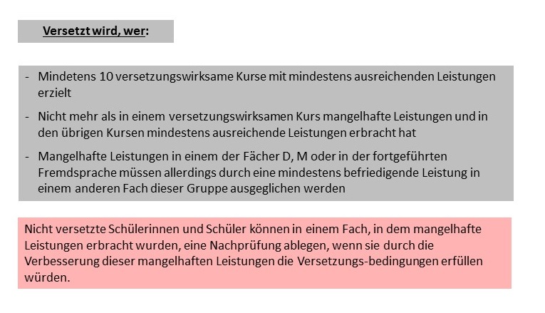 Die Versetzung von der Einführungsphase in die Qualifikationsphase ist die letzte Versetzung der Schullaufbahn. Die „Q-Phase" selbst wird weitgehend als eine Einheit betrachtet. Die hier erbrachten Leistungen werden zum großen Teil in die Abiturnote eingebracht.