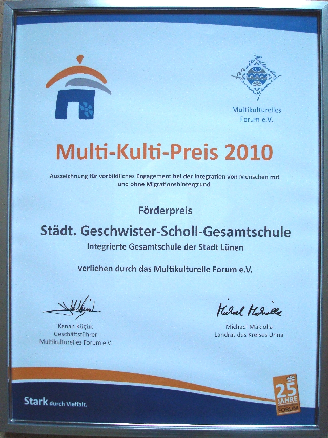 2010 und 2011 wurde die Geschwister-Scholl-Gesamtschule Lünen vom Multikulturellen Forum Lünen für ihre vielfältigen Integrationsangebote ausgezeichnet.