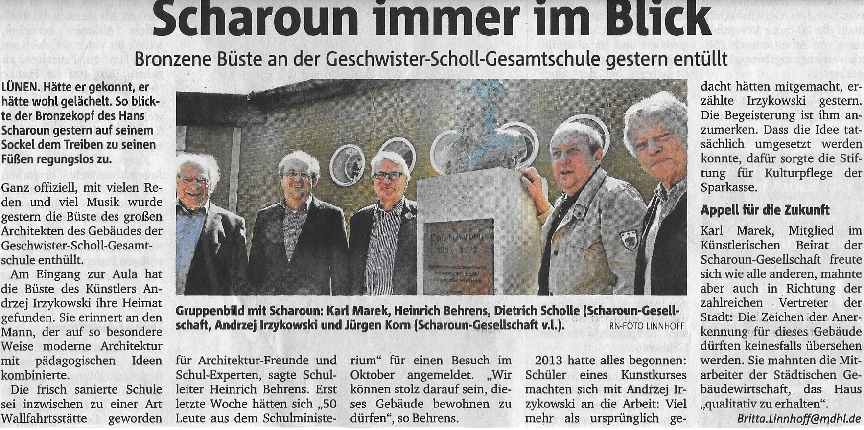 Der Lüner Maler und Bildhauer Andrej Irzykowski hat die Skulptur im Auftrag der Scharoun Gesellschaft Lünen e.V. gestaltet. - "Scharounbüste eingeweiht" - Lesen Sie den Pressebericht vom 28.08.2014
