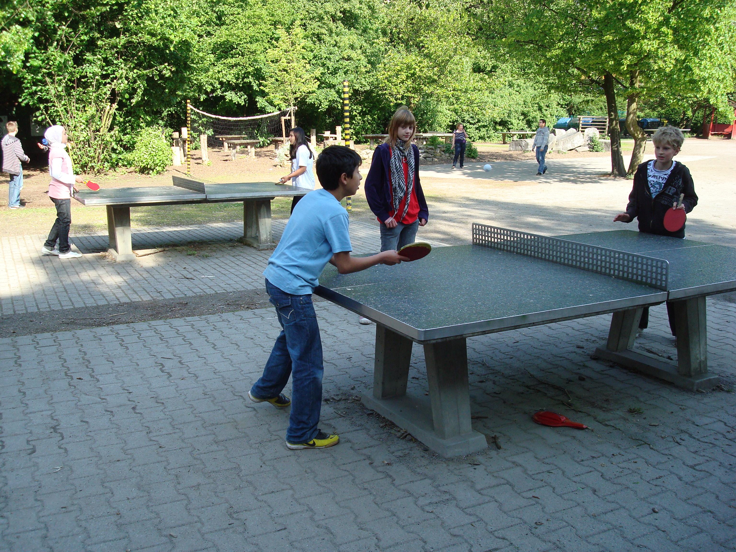 - Auf dem weitläufigen Schulhof gibt es mehrere Tischtennisplatten sowie Basketballkörbe.