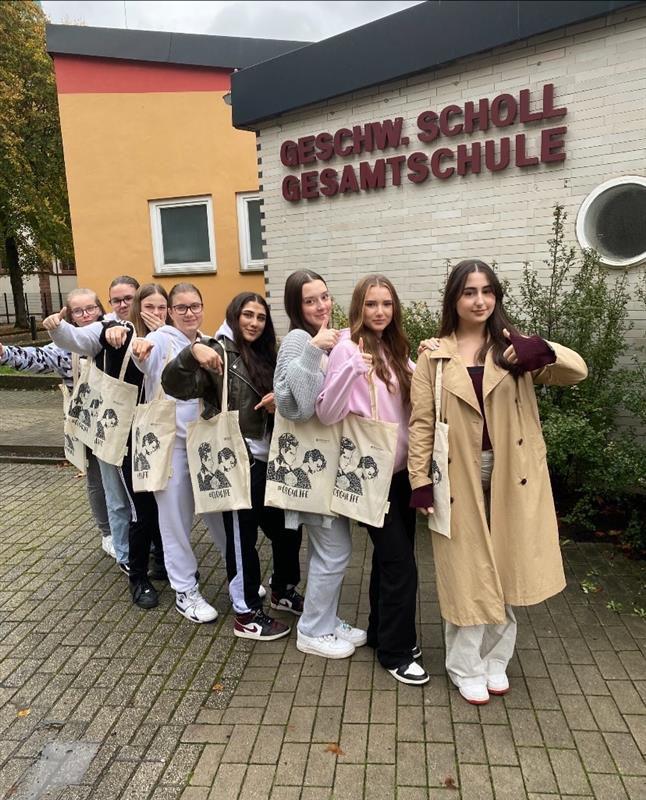 Die Klasse 10b hat eigene GSG – Jutebeutel designt und produziert, um mit dem Erlös des Verkaufs den Förderverein zu unterstützen. Zudem sollte mit den Beuteln, die C02-neutral hergestellt wurden, zukünftiger Müll an der GSG möglichst reduziert werden. Gesagt getan: die ganze Klasse hat sich an der Aktion beteiligt und in Pausen und an Schulveranstaltungen die Beutel an die Frau bzw. den Mann und „Schollis“ gebracht. Unsere Klassenlehrer*in Frau Borgelt und Herr Beyer waren richtig stolz auf unser Ergebnis und unsere gute Tat.