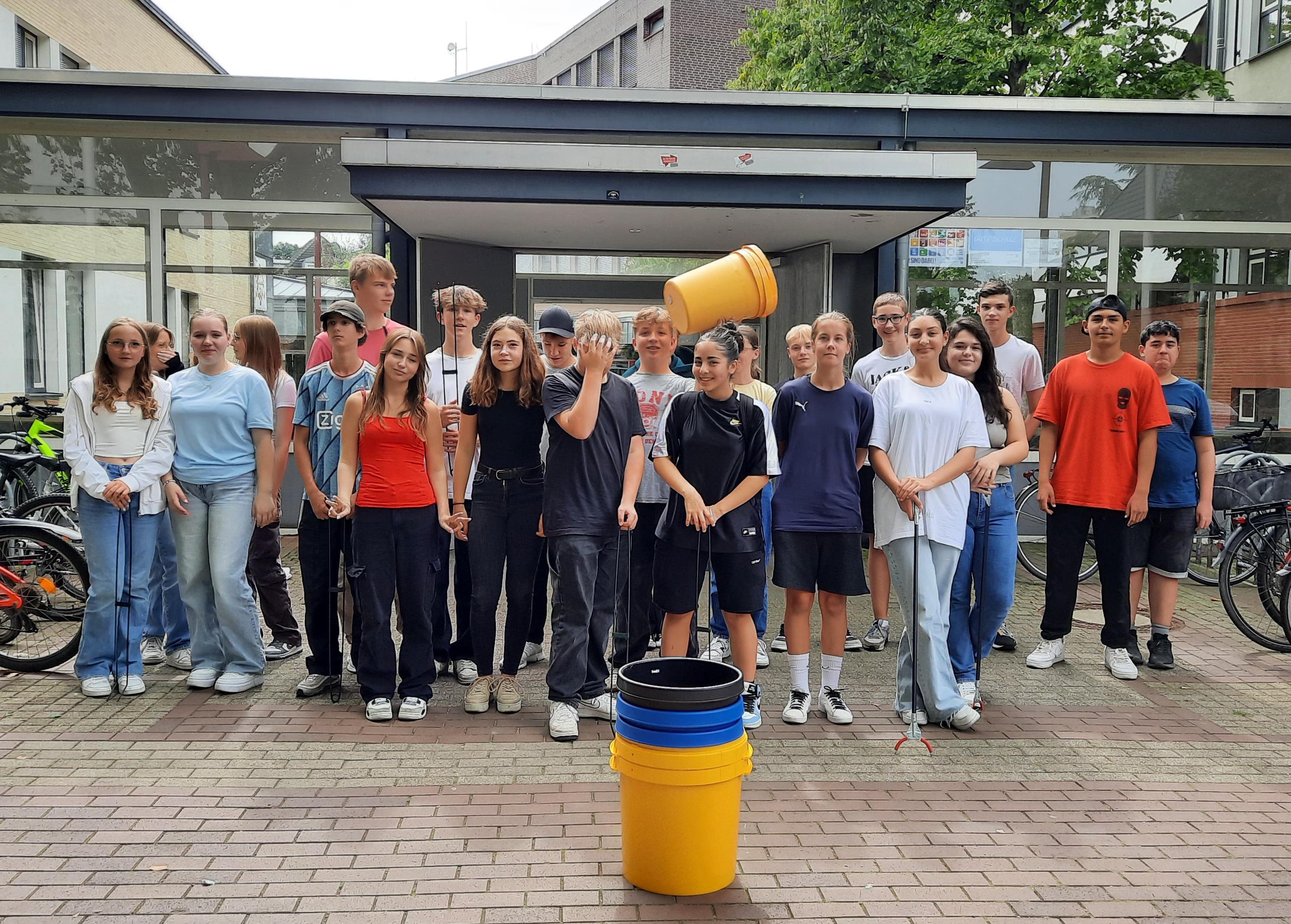 In der 34. Schulwoche hat die Klasse 8a im nahen Umfeld der Schule Müll aufgesammelt. Unterstützung erhielten sie von Jana, einem Schaustellerkind, die anlässlich der Himmelfahrtskirmeskirmes in Lünen vorübergehend in der Klasse unterrichtet wurde.