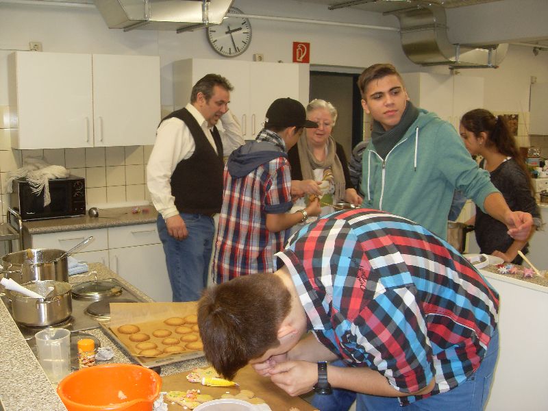 Schülerinnen und Schüler des Hauswirtschaftskurses des 10. Jahrgangs der Geschwister-Scholl-Gesamtschule Lünen haben gemeinsam mit Frau und Herrn Eschert vom Altenpflegedienst Eschert sowie dem pensionierten Bäcker Bittner Weihnachtsplätzchen in der Küche der Schule gebacken.