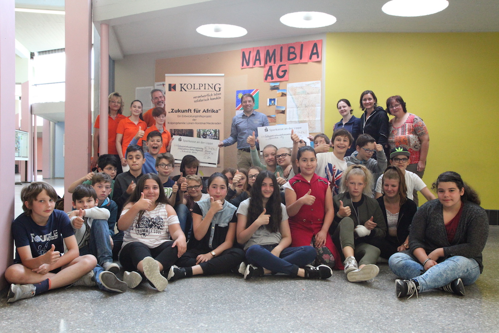 Die Klasse 6b von Frau Beck-Nawroth und Frau Hunger war mit 392 Runden die sportlichste Klasse und bekam von Schulleiter Christian Gröne auf dem folgenden Wandertag Eis ausgegeben, gleiches galt für die Klassen 6a und 5c. Horst Riehl, Ursula Naßwetter, Annika Naßwetter und unsere Schülerin Marleen Symma als Vertreter der Kolping-Familie Horstmar freuten sich über eine Spende in Höhe von 1475 Euro, die in das Work Opportunity Programme fließt. Damit werden Jugendliche und junge Erwachsenen in Uganda unterstützt einen Einstieg ins Berufsleben und damit in die Selbstständigkeit zu finden. Mit der gleichen Summe bedacht wird unsere Partnerschule, die Martin-Luther-Highschool in Namibia. Tanja Kölker nahm den Scheck symbolisch für die Namibia-AG entgegen. 2016 war eine Delegation aus Lünen in Namibia und hat neben einem Sport- und Musikprojekt auch ein Solarprojekt durchgeführt. Da die Stromversorgung nicht gesichert ist, bildet es einen wichtigen Baustein zur energetischen Versorgung der Schule und soll weiter ausgebaut werden. Der Rest des Geldes kommt unserer Schule zugute und fließt in schulische Projekte wie das Mittagspausen- und Ganztagsangebot.