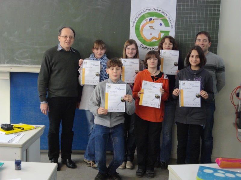 Die sechs Schülerinnen und Schüler der naturwissenschaftlichen Galileo-Klasse wurden für ihre herausragenden Leistungen beim landesweiten Schülerwettbewerb der Sekundarstufe 1 "bio-logisch" ausgezeichnet. Unter der Leitung von NW- und Klassenlehrer C. Gröne haben sie sich unter dem Oberthema "Kraut und Rüben" mit den Besonderheiten von Kohlrabi und Möhre auseinandergesetzt, indem sie deren Aufbau und Querschnitte verglichen, die Pflanzen ihren Familien zugeordnet, im Experiment den Lotuseffekt erforscht und in einer Umfrage die Beliebtheit von Nutella und Rübenkraut erkundet und deren Beitrag zu einer gesunden Ernährung beleuchtet haben. Melisa Adigüzel, Lena Kowalski und Melanie Montag erhielten für eine Arbeiten eine Urkund, weil sie zu den besten 25 % der landesweit knapp 3000 abgegebenen Arbeiten in den Klassen 5 und 6 gehörten. Sonja Bless, Chantal Beermann und Luka Donat wurden darüberhinaus mit zwanzig anderen Schülerinnen und Schülern aus dem Regierungsbezirk Arnsberg zu einem Regionaltag ins Landschaftsinformationszentrum am Möhnesee eingeladen und mit einer GPS-Schatzsuche rund um den Möhnesee und den Arnsberger Wald dafür belohnt, dass ihre Arbeiten zu den besten 5 % gehörten. Diese Leistung beeindruckte auch Schulleiter H. Behrens, der die Galileo-Kinder zusätzlich mit einem Büchergutschein überraschte. Mehr über die Galileo-Klasse erfahren Sie hier. |