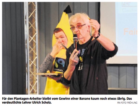 Die Schülersprecherin Franzi Stoewer führte souverän durch die Feier. Nach der schwungvollen musikalischen Eröffnung durch die Musikklasse 8d und den Begrüßungsworten des Schulleiters moderierte Franzi eine Talkrunde, die unterbrochen wurde durch erklärende Video-Clips zum Thema und Kurzinterviews mit dem Publikum, durchgeführt von drei „Bananen“, Schülern im Fairtrade – Bananenkostüm.