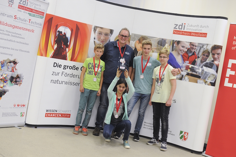 Unsere Nachwuchsgruppe mit Schülern aus dem sechsten und achten Jahrgang hat sich in der Uni Bochum beim ZDI-Wettkampf gut behauptet und unerwartet den dritten Platz belegt. Wir hatten zwei Aufgaben in den AG-Stunden vorbereitet und am Wettkampftag haben alle konzentriert bis zum Ende gearbeitet und es konnten dann im letzten Lauf fünf Aufgaben vom Roboter erledigt werden.