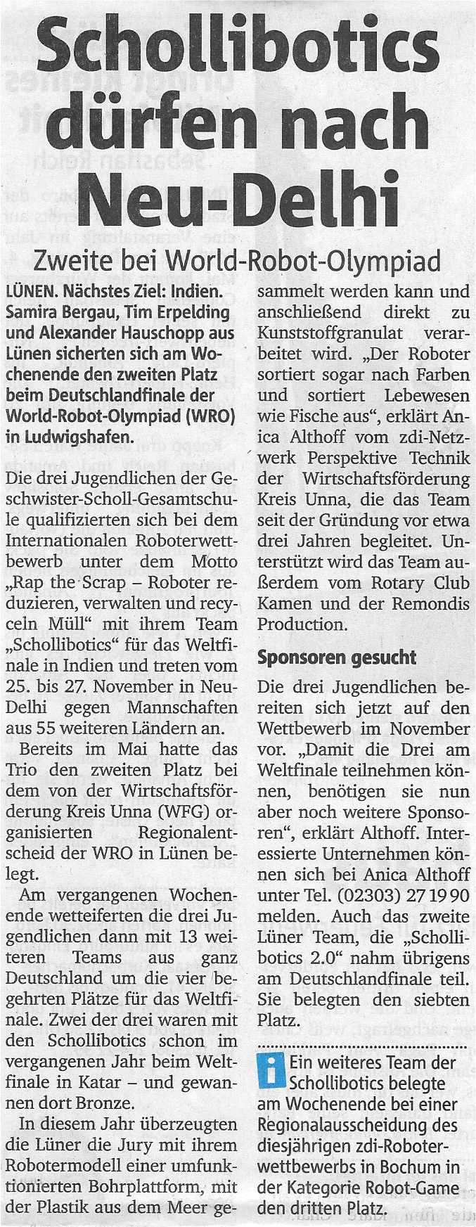 Am 18.06.2016 haben Schülerinnen und Schüler unserer Schule im WRO Deutschlandfinale den zweiten Platz gemacht und dürfen für Deutschland in Indien an der Weltmeisterschaft teilnehmen. Nun suchen sie Sponsoren.