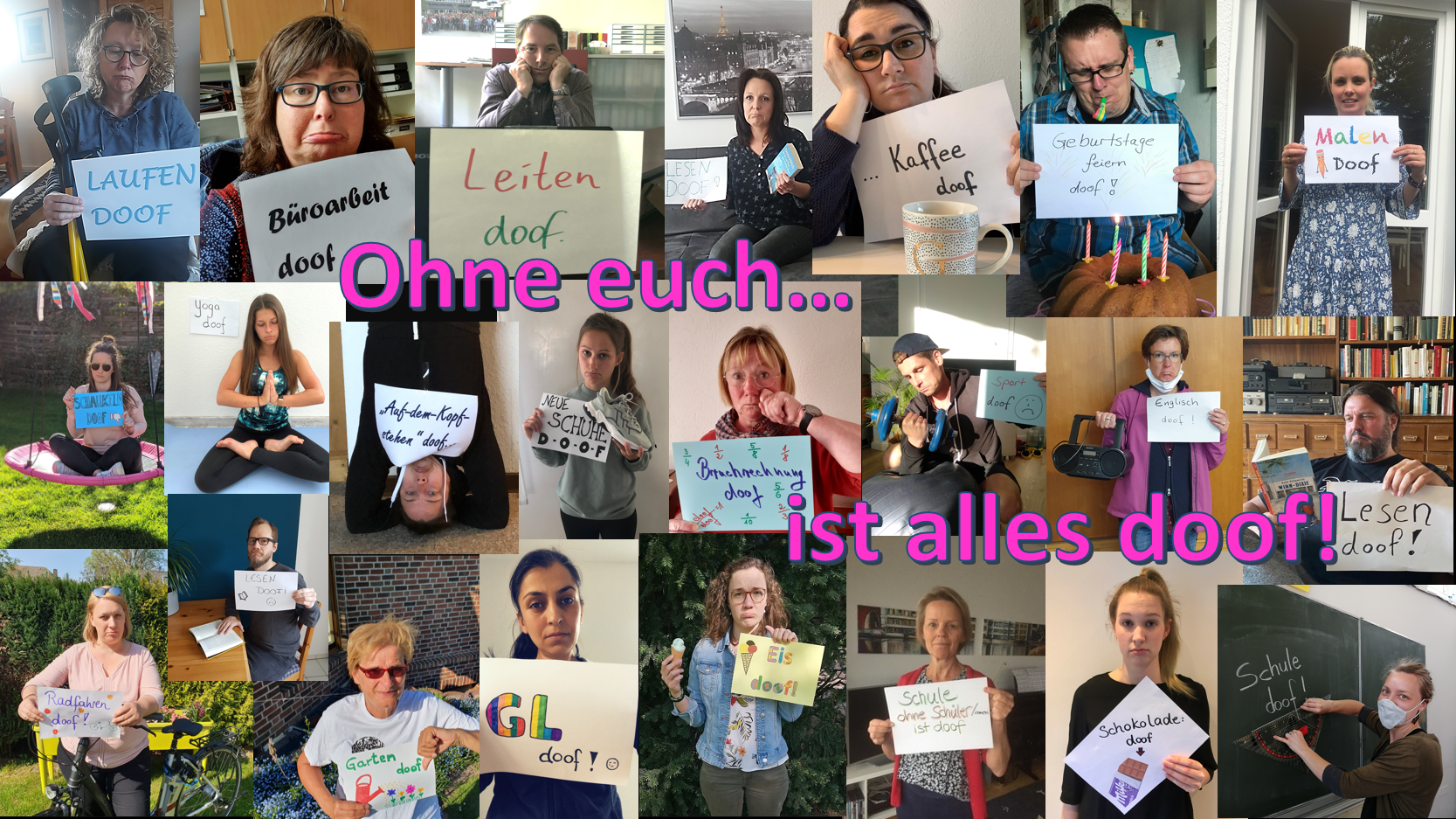 Liebe Schülerinnen und Schüler, die Schule hat zwar zum Teil schon wieder begonnen, aber nur mit wenigen von euch. Wir freuen uns darauf, euch schon bald alle wieder in der Schule anzutreffen, denn ohne euch ist hier einfach alles doof! Bleibt gesund und munter!